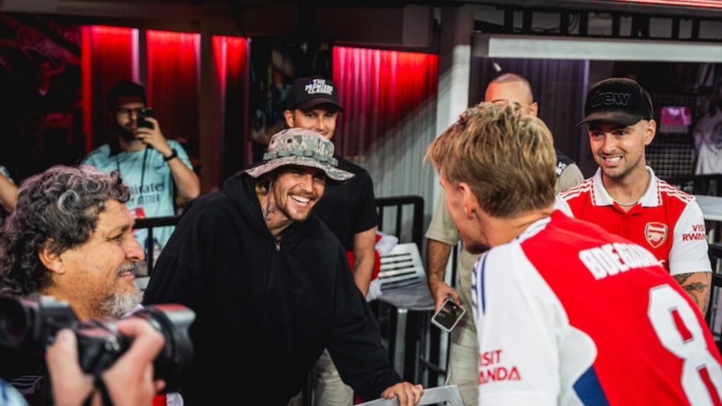 Justin Bieber, Will Poulter, and more celebrities attend the Arsenal vs. Manchester United game at SoFi Stadium in California.